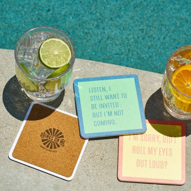 downright funny coasters, cocktail napkins, greeting cards and tea-towels. Watch for NEW wine bags in 2026.